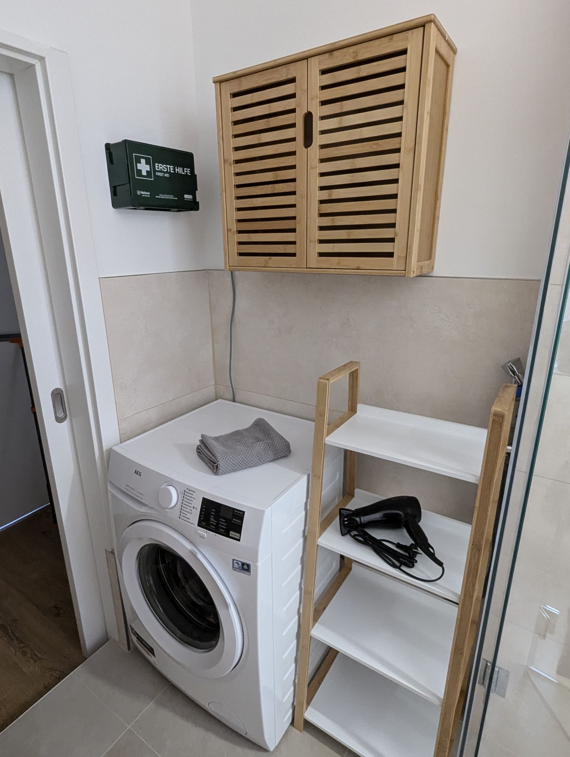 Im modernen Bad beginnt und endet der Tag auf entspannte Art. Die ebenerdige Dusche kann schmal oder in voller Raumbreite genutzt werden. Dank der Waschmaschine können Sie Ihre Lieblingsstücke jederzeit für das nächste Abenteuer waschen.