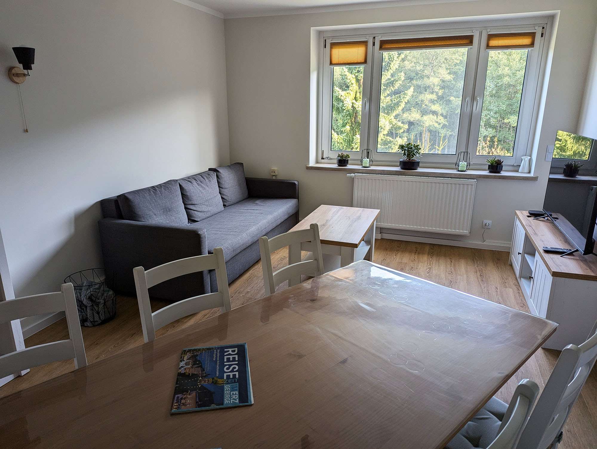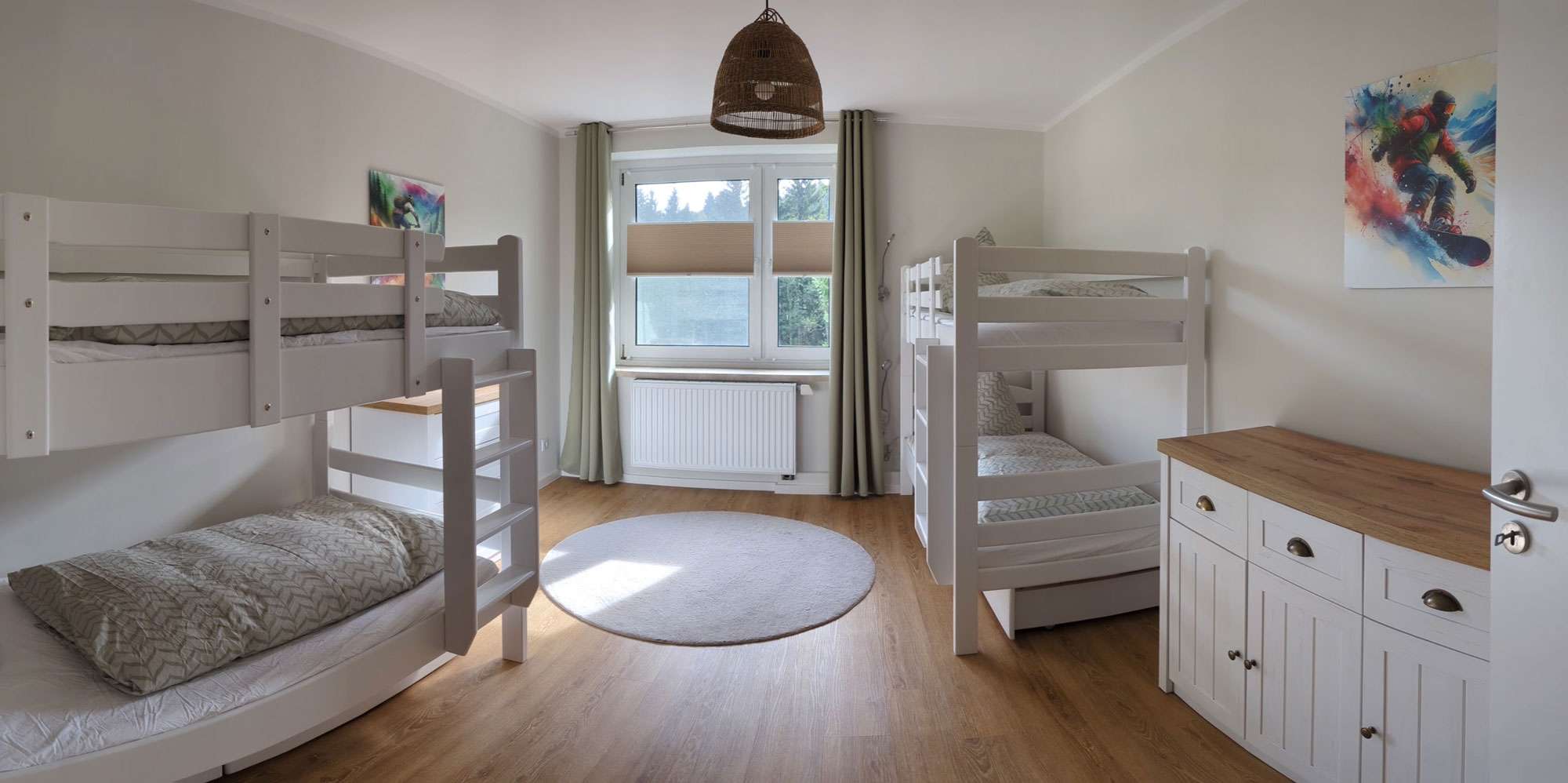 Im schönen Kurort Oberwiesenthal liegt diese modern eingerichtete Wohnung für bis zu 6 Personen. Es gibt zwei Schlafzimmer – eines mit Doppelbett und großem Kleiderschrank sowie ein zweites Schlafzimmer mit 2 Etagenbetten. Für unsere jüngsten Besucher stellen wir gern ein Kinderreisebett im Schlafzimmer sowie Hochstuhl am Esstisch bereit. Außerdem stehen Teller, Becher, Besteck und Spielsachen für Kinder bereit. So erleben besonders Familien einen rundum gelungenen Urlaub.