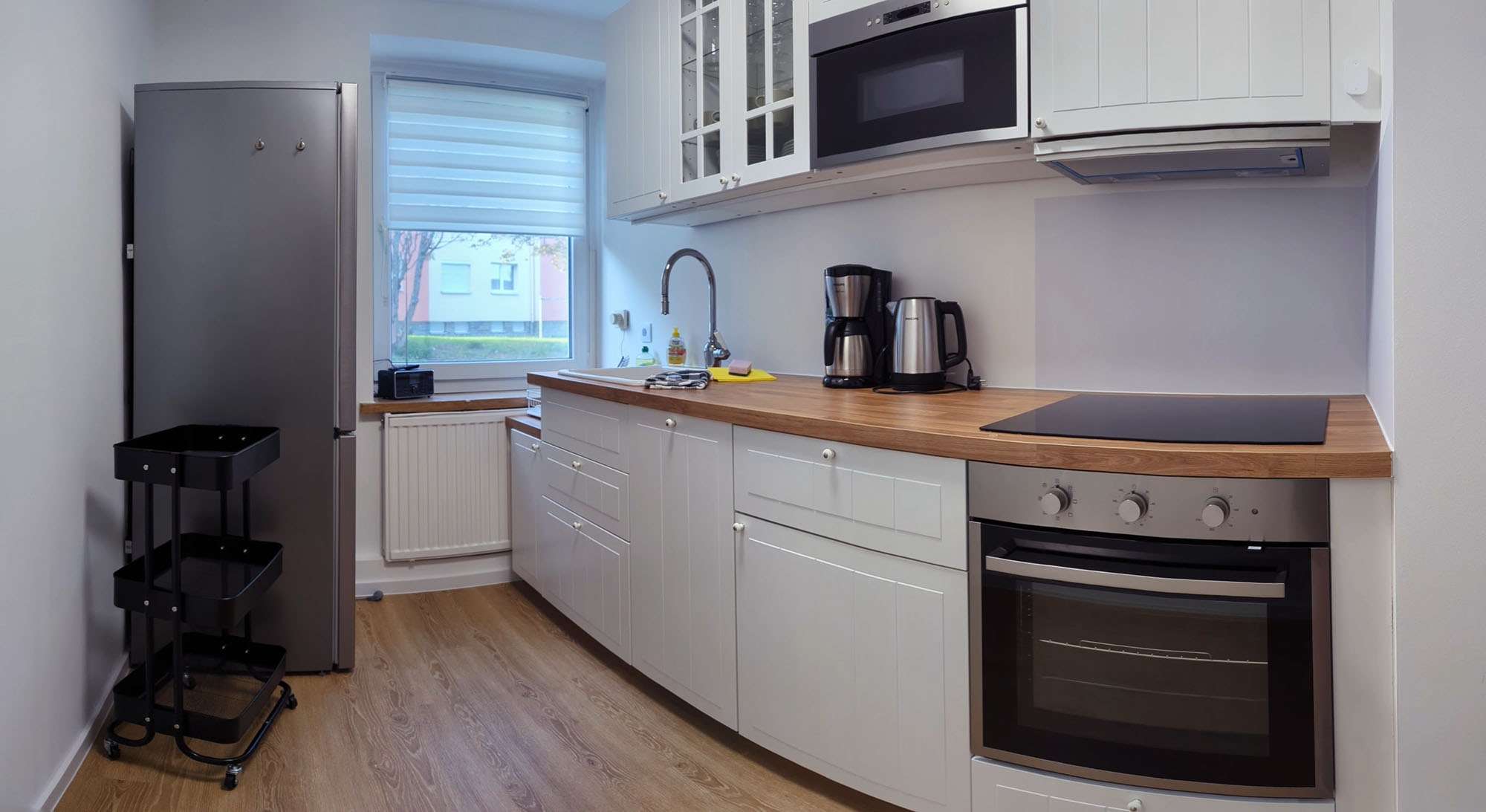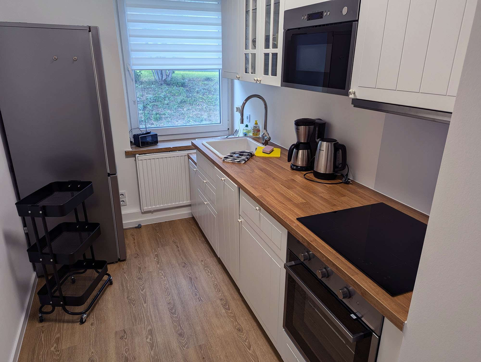 Besonders schön ist die voll ausgestattete Küche mit großem Kühlschrank und drei Gefrierfächern. Auf dem Induktionsherd kochen Sie in Windeseile Ihre Lieblingsgerichte. Nutzen Sie den Ofen mit Türsicherung für Aufläufe, Kuchen und andere Leckereien. Und kümmern Sie sich nicht um das benutzte Geschirr – dafür gibt es einen integrierten Geschirrspüler.